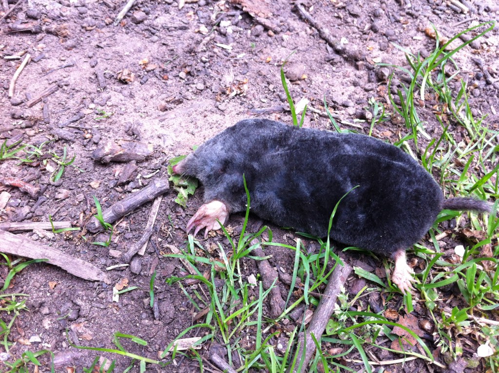 Description: Cylindrical body; thick, dark grey or black fur on back, underside yellow-brown; very small eyes hidden in fur; large, spade-like forelimbs, shorter hindlimbs; powerful claws; long pink snout. Moles rarely come above ground, except when excavating burrows, if displaced by flooding or when young disperse.