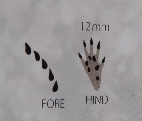 Tracks: These are rarely found. Hind print has 5 digits and measures 1.5 cm long x 1 cm wide; fore print a series of dots made from the claws as moles walk on the front edges of their front feet.