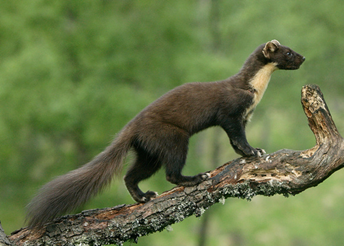 Description: The European pine marten has light to dark brown fur which is short and coarse in the summer, growing longer and silkier during the winter. It has a cream/yellow coloured “bib” marking on its throat and chest and a long tail. Similar in appearance to stoats and weasels, but much larger and with more pronounced ears and a long bushy tail.