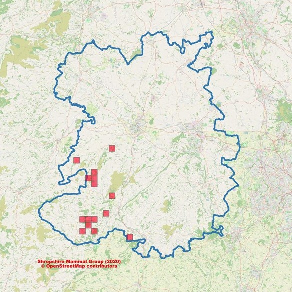 Distribution and main sites: At least 18 individual pine martens have been recorded on camera traps in Shropshire. One of those records was confirmed to be of an animal which had been released in the Forest of Dean in 2019 by Gloucester Wildlife Trust. The woodlands around Clun and The Stiperstones appear to be the stronghold of the population.